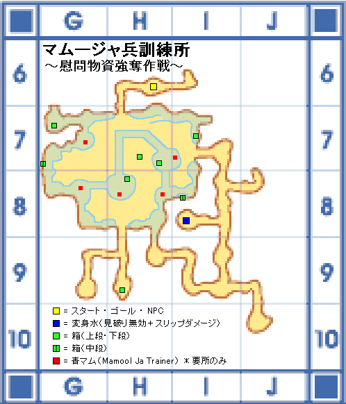 - 「変装の水」の泉(I-8)でマムージャに変装すると、マムージャに感知されずに移動できる。